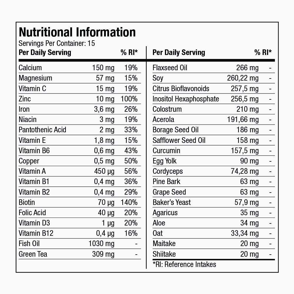 - Поєднання вітамінно-мінерального комплексу (вітаміни A, C, D3, E, група B, цинк, залізо, магній, кальцій) та омега-комплексу (риб’яча олія (EPA/DHA), лляна олія, олія сафлору, олія огірочника) підтримує енергію, нервову систему, кістки, серце й судини. Антиоксидантна формула на основі цитрусових біофлавоноїдів, екстракту кори сосни, насіння винограду, куркуміну та зеленого чаю підтримує імунітет, здорове травлення й бар’єрний захист організму, роблячи RiteStart Multivitamin Complex зручним щоденним рішенням все в одному.